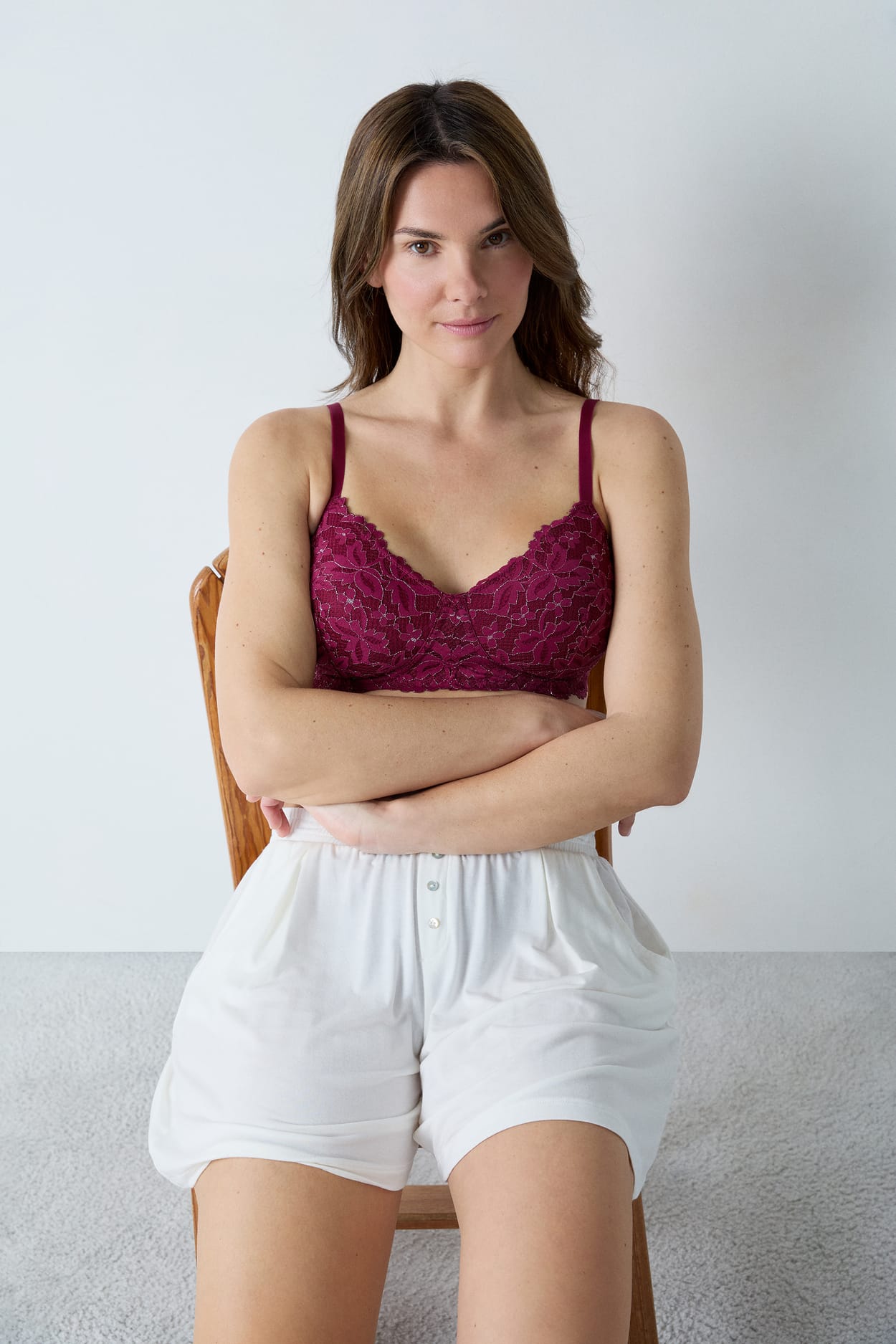Ten biustonosz bez fiszbin posiada dwustronne kieszonki z mikrofibry, które mogą pomieścić wszystkie rodzaje protez. Specjalnie zaprojektowany, aby zapewnić doskonały komfort bez rezygnacji ze stylu i kobiecości, odsłania delikatnie kwiecistą, opalizującą koronkę.
