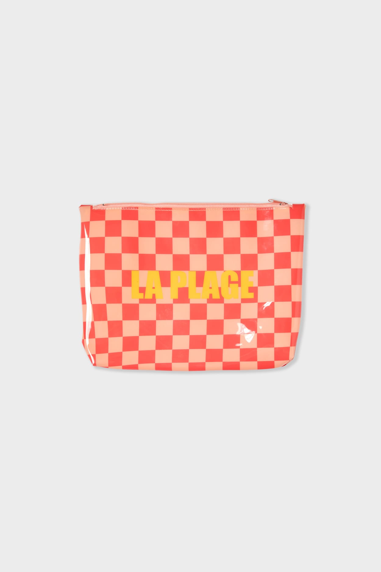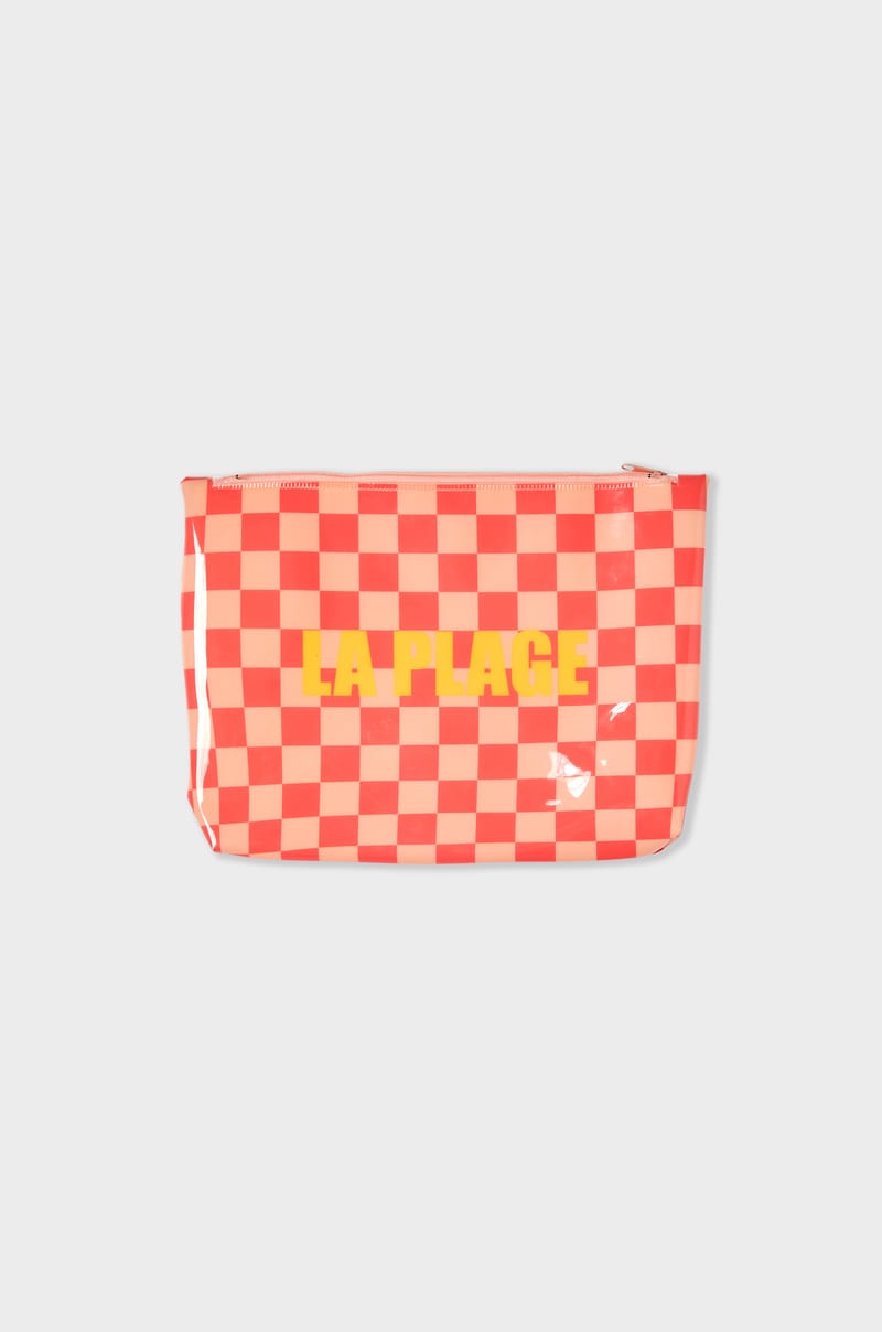Niezbędna na lato, ta kosmetyczka piżamowa przyjmuje się z wdziękiem dzięki wzorowi w kratę i nadrukowi "La Plage...