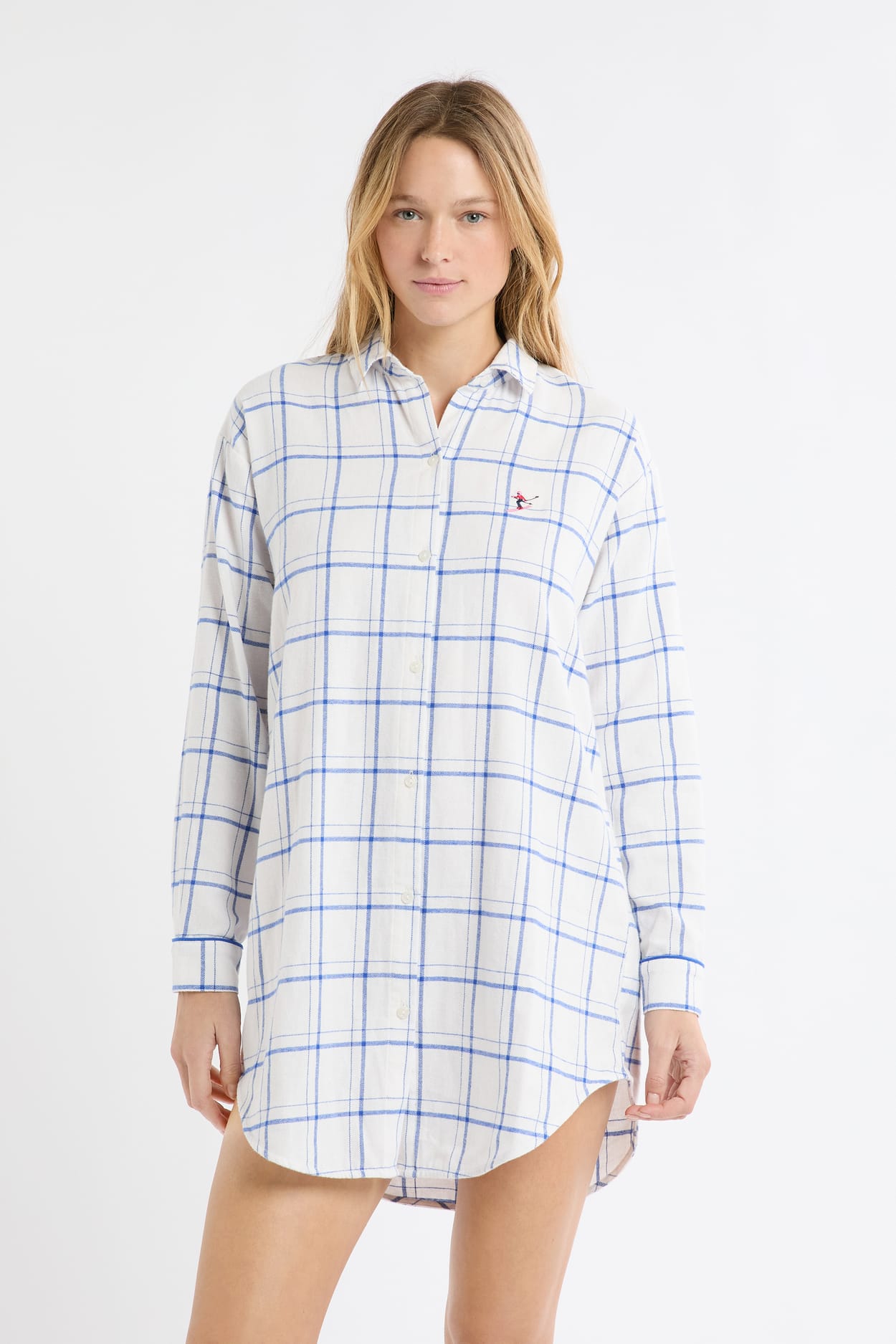 Gwiazdorski nadruk sezonu, ta koszula nocna z długimi rękawami ubiera się w kratę. Wykonana z bawełny, wyposażona jest w klasyczny kołnierzyk, zapięcie na guziki i naszytą kieszeń ozdobioną haftem.