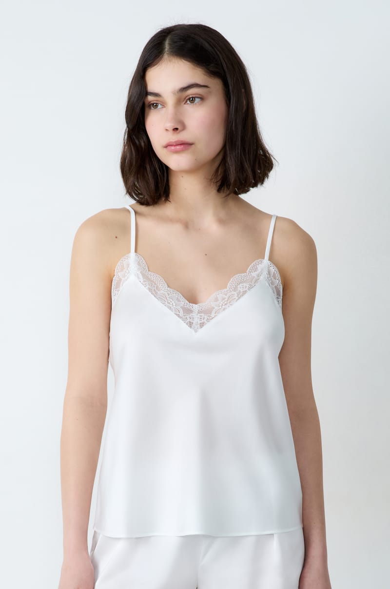 Niezbędny element eleganckich nocy? Satynowa koszulka na ramiączkach obszyta delikatną kwiatową koronką.
