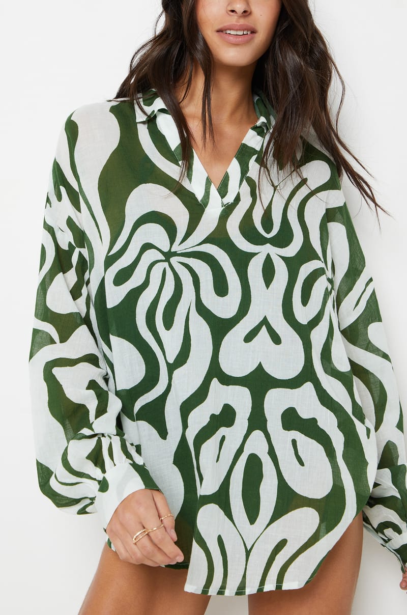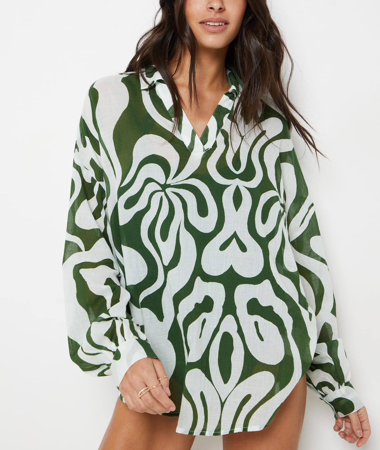 Można ją nałożyć na strój kąpielowy: ta krótka tunika jest wykonana z ultra lekkiego materiału, idealnego na gorące dni. Wyposażona w długie rękawy w stylu balonowym, jej kwiatowy wzór elegancko zdobi całość. Dekolt w kształcie litery V opada, odsłaniając skórę i nadając całości zwiewny wygląd.