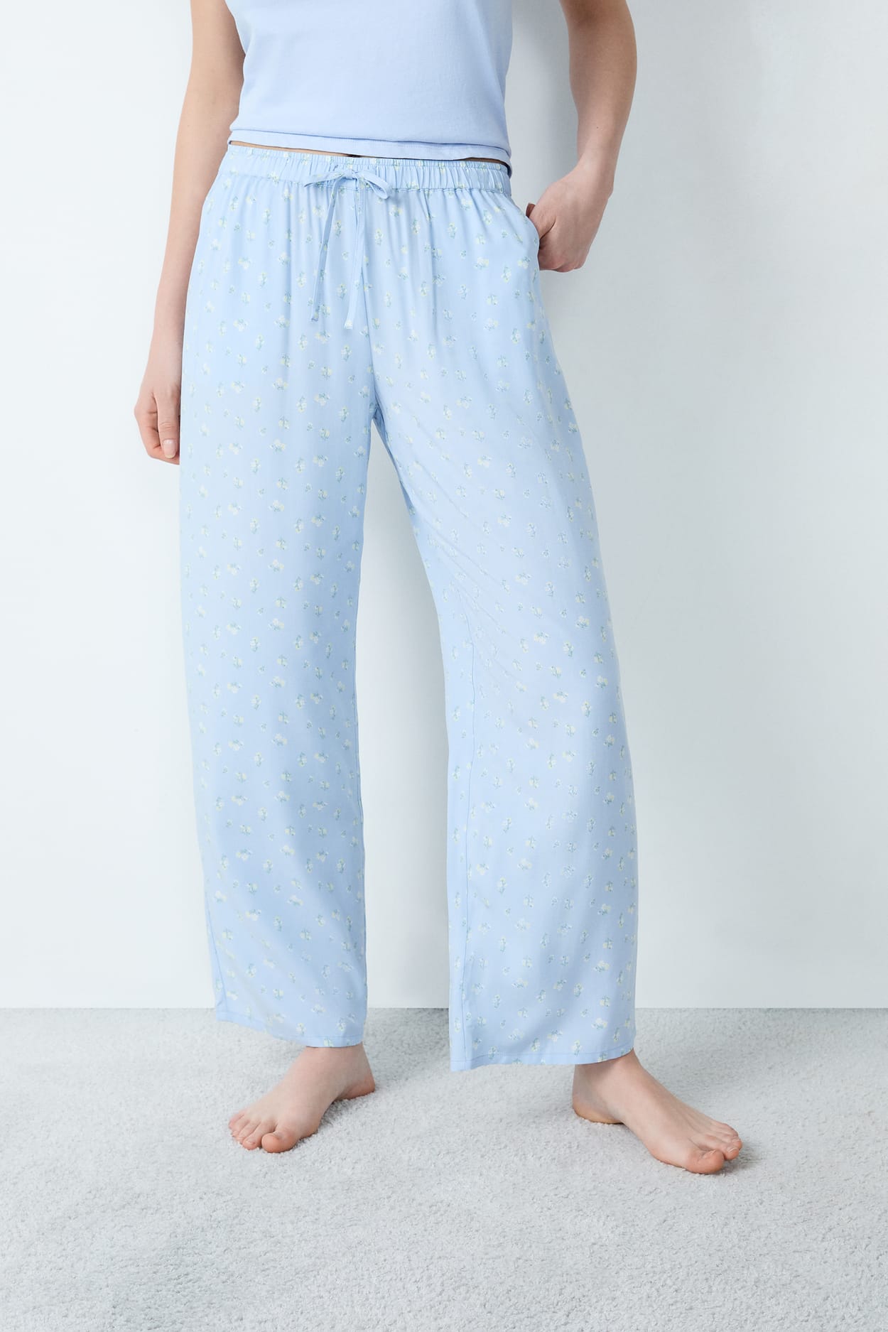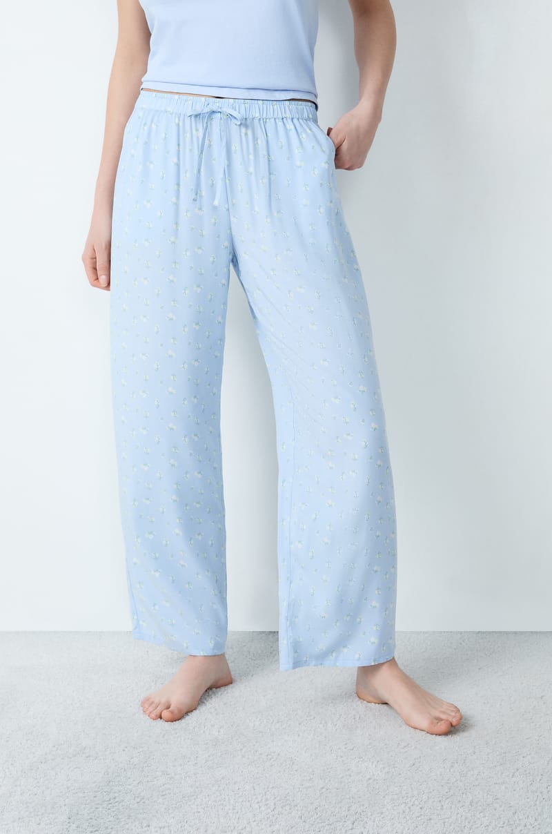 Kwiatowy wzór zdobi te spodnie od piżamy. Dzięki lekkiemu materiałowi, sylwetka prezentuje się lekko. Praktyczne, wyposażone są również w dwie kieszenie z przodu.