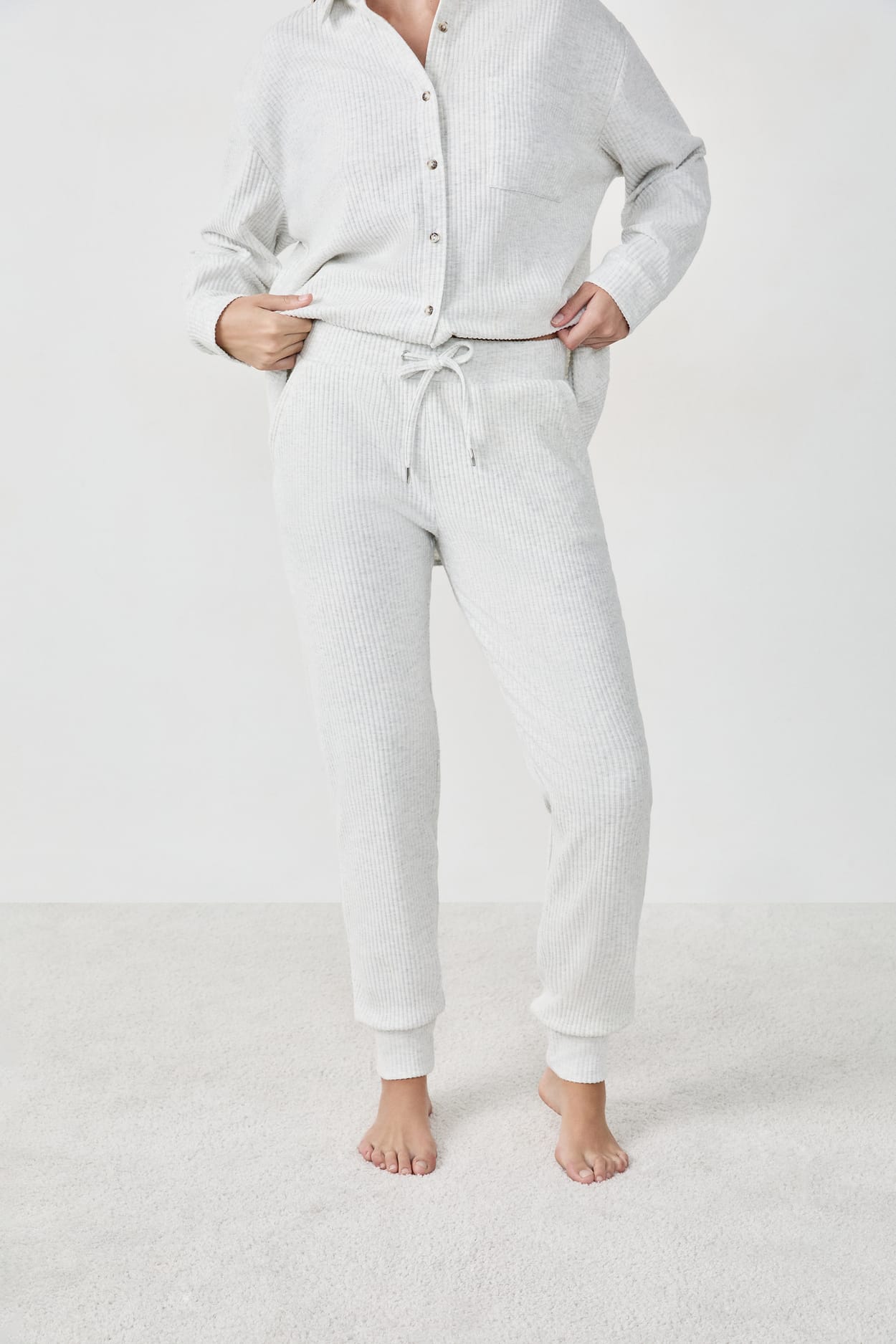 Te spodnie piżamowe z prążkowanej dzianiny w paski zapewniają komfort i miękkość. Wyposażone w elastyczną talię i ściągnięte kostki, tworzą nowoczesny i wygodny look.