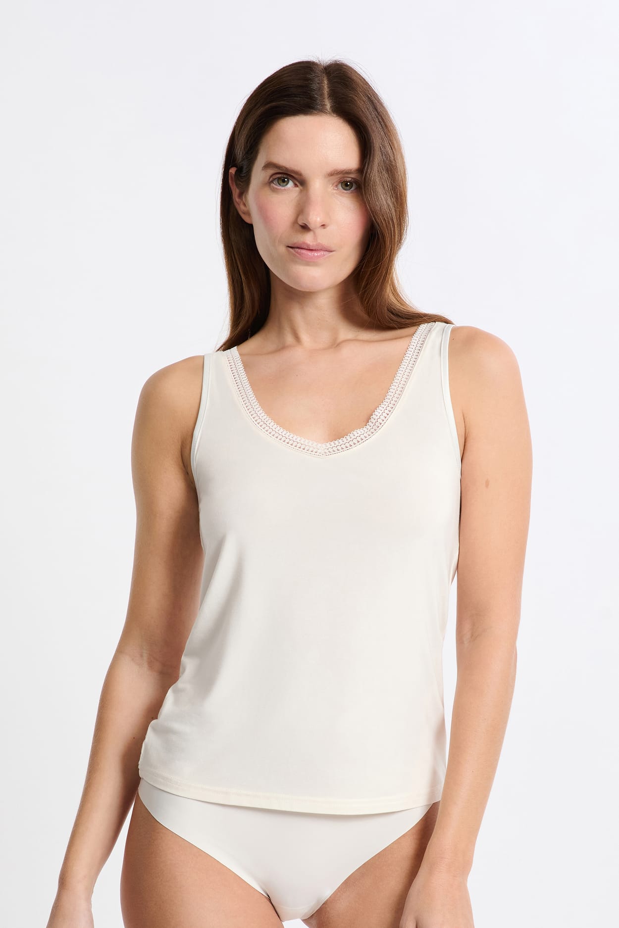 Conçu en matière douce, ce débardeur opte pour une transparence subtile et un effet seconde peau. Il est réhaussé d’une toute nouvelle dentelle graphique et moderne. A porter seul ou sous vos pulls il offre un maintien au chaud de +3° au porté.